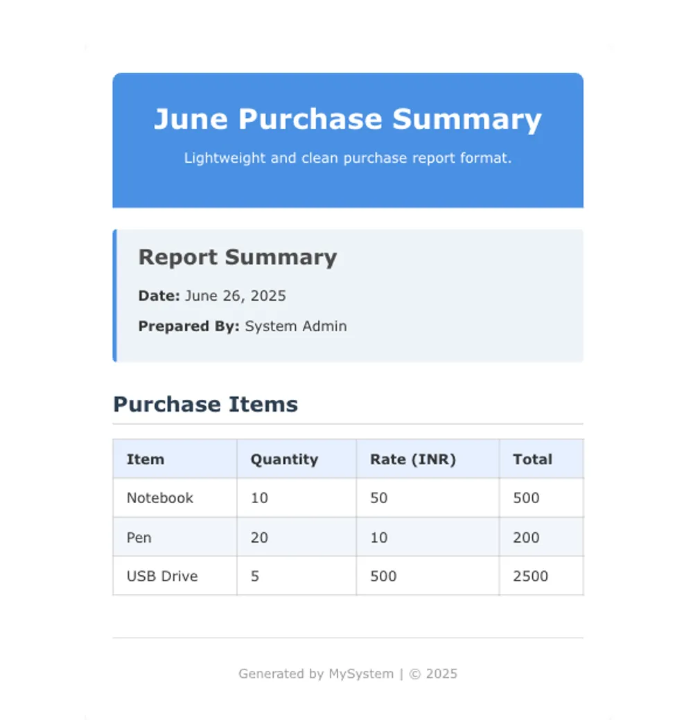 <p>Generated by MySystem | &copy; {{ year or "2025" }}</p>